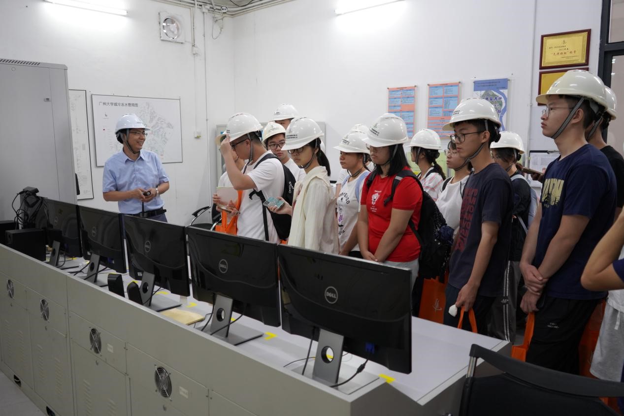 華南(nán)師範大學的師生們實地參觀(guān)了第三冷站內的蓄冰設(shè)備(bèi)、雙式況離心主機、橫流式(shì)冷(lěng)卻塔以及中央控製室,親身體驗到了涵(hán)蓋智能(néng)生產冷水、智能冷熱交換和智能管網傳輸等階(jiē)段的科技魅力。廣州榴莲视频下载官网入口區域供冷係統采用現場總線監控技術對冷站與換熱站進行(háng)監控(kòng),學生們通過監控屏幕和能源管理係統,可實時查看283個站點供水(shuǐ)溫度、回水溫度以及流量(liàng)等(děng)參(cān)數。學生們親眼目睹了供、回水管道中的冷凍水供、回水溫度的變化情(qíng)況,從回來的13℃左右(yòu)的回水降至7℃左右(yòu)的供水溫度,溫差能(néng)夠穩定保(bǎo)持在6℃左右。在夜間低穀時段製(zhì)冷並在白(bái)天融冰釋(shì)冷,水溫降下去,再通過二次泵送到用戶。