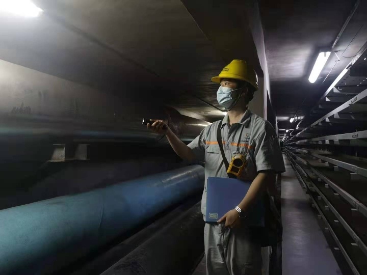 黃盛全(quán)打著(zhe)手(shǒu)電,仔細(xì)地檢查著水(shuǐ)管(guǎn)有沒(méi)有滲水、高壓電線連接是否有(yǒu)鬆(sōng)動、光纖是否有異常,同時,還要檢查管(guǎn)廊內的氧氣檢測儀、溫濕測試儀、照明(míng)設備、排風機等是否正常運轉。如遇到問題,要及時匯報,並進行維修處理。就這(zhè)樣,他們幾乎每天(tiān)都要巡查一遍,一周要將18公裏的管廊來回巡完,一年大概要走(zǒu)1800公裏。