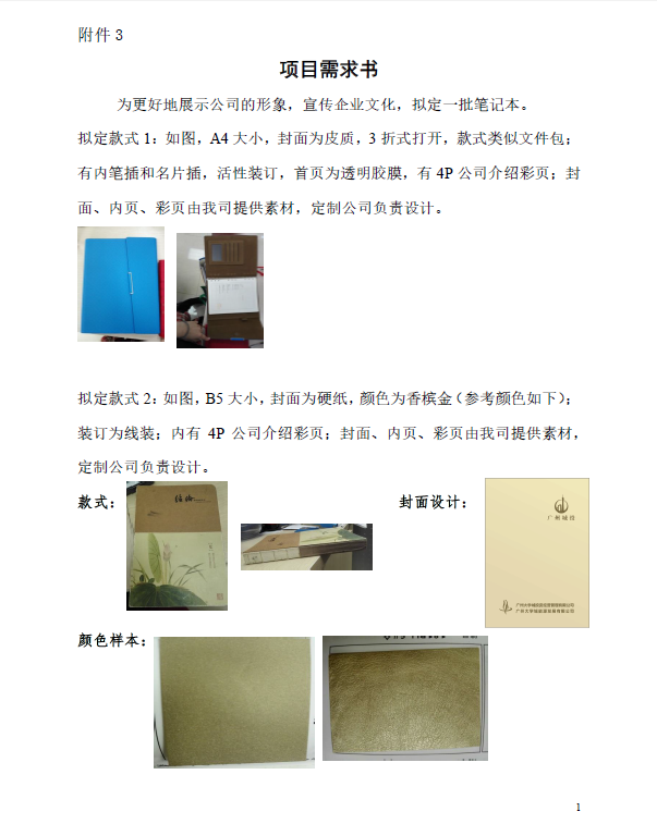 確定一(yī)家中標供應商,為提供我司筆記本定(dìng)製服務。筆記本暫定(dìng)款式共兩款,合計采(cǎi)購數量600本,具體工作內容詳見詢價文件中《項目需求書(shū)》(見(jiàn)附件3)。
