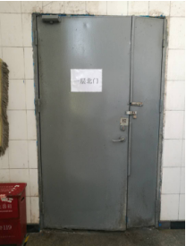 (一)3#冷站(zhàn)首層冰(bīng)槽(cáo)南北兩扇門防火門長年使用(yòng),鎖(suǒ)失靈,門扇破損(見下圖)。處理方案:拆(chāi)除兩扇破損防火門,安裝兩扇新防火門框+門扇。