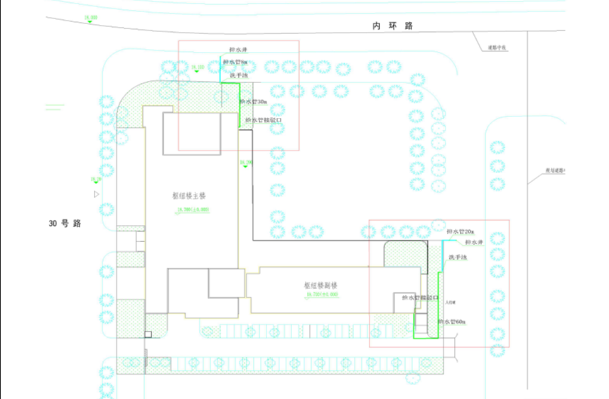 在信息樞(shū)紐樓東側、北側兩處各設置一個洗手池,同時(shí)配備壓式延時水龍頭,給(gěi)排水就近接駁安裝,詳見洗手池(chí)、給排水平麵位置布置圖(tú)見附圖1;洗手池基礎剖麵及水(shuǐ)管安裝示意圖(tú)見附圖2。