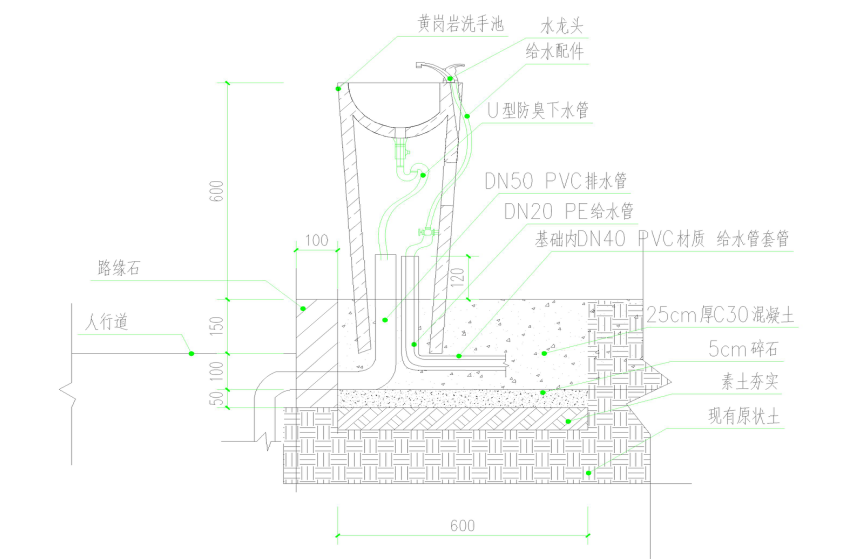 | 1 | 洗手池 | 個 | 2 | 1、天(tiān)然花崗岩,整塊無拚裝,長度40cm,寬度35cm,高度75cm 2、給水管、排水管(guǎn)從洗手池內部(bù)接(jiē)入詳見洗手池基礎剖麵及水管安裝示意(yì)圖 |