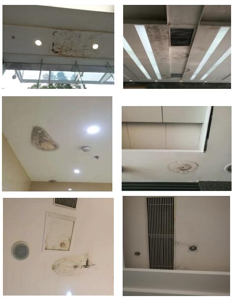 原因:天花空調(diào)出(chū)風口冷凝水、空調管漏水等滲入引(yǐn)起黴漬;