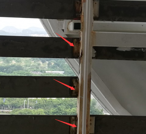 鋼角碼鏽蝕較為(wéi)嚴重,百葉與鋼角碼連接螺栓鏽蝕(如(rú)上(shàng)圖)