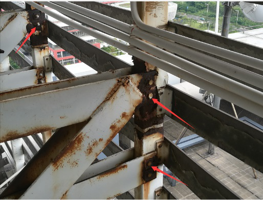 部分主柱端頭和連接螺栓鏽蝕(shí)嚴重(如上圖)
