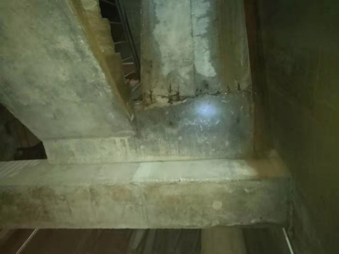 3、過江隧道南、北岸出入口樓梯裸露的鋼筋除鏽+保護層修複。將鬆散碎石剔除,鋼筋除鏽,細石混凝土修複。