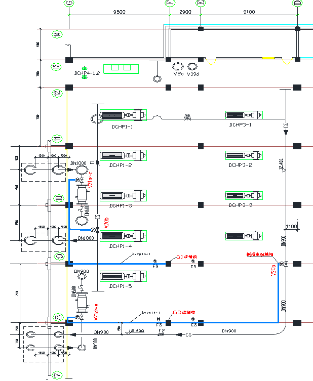 該項目重點解決4#冷站爆管時,判斷(duàn)漏點後能通過供回水管的閥門迅速切斷該組團的(de)供回水,避免影響擴大至其他組團,保障其他組團(tuán)的供冷。現擬G1G3組團給水總管(guǎn)分別加裝DN1000DN900電動蝶閥,組團回水過濾器進水閥分別加裝3個和2DN600電動蝶閥(安裝位置見下頁圖),實現組(zǔ)團爆管時能迅速(sù)切換,從而避免擴大影響至其他組(zǔ)團,保障其(qí)他組團的用戶正常用冷。